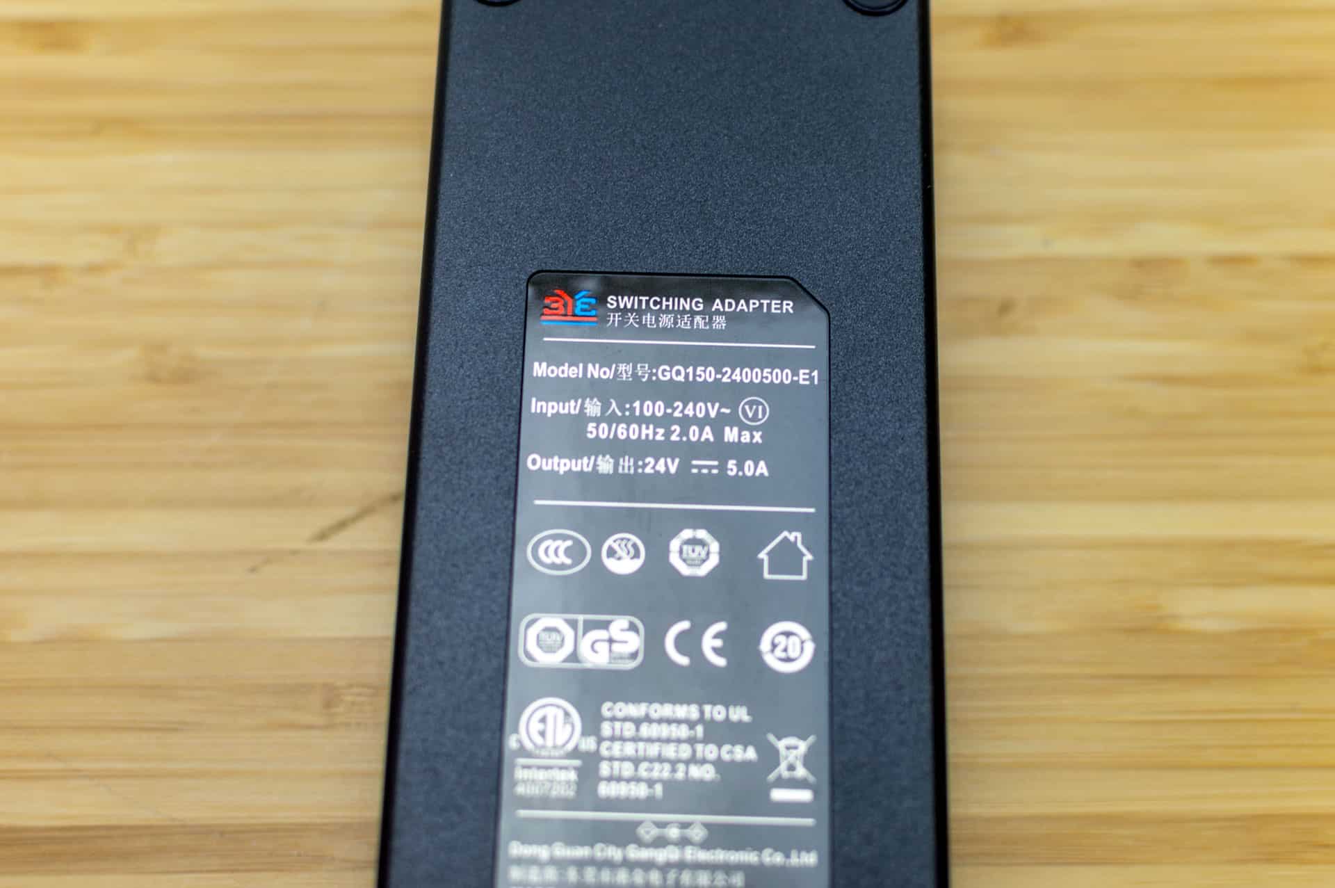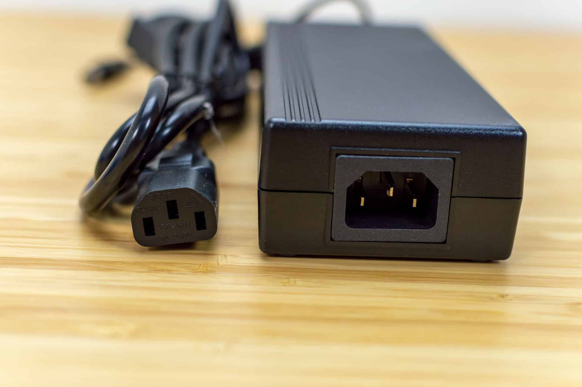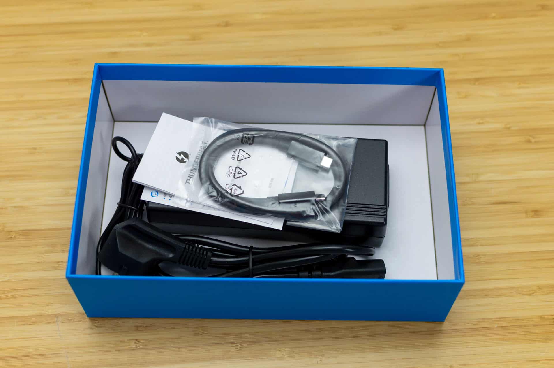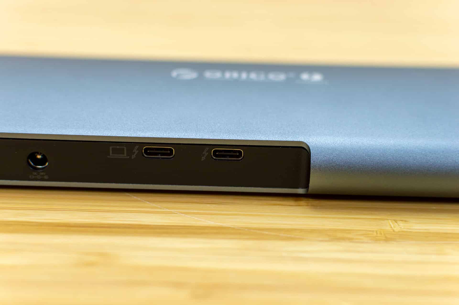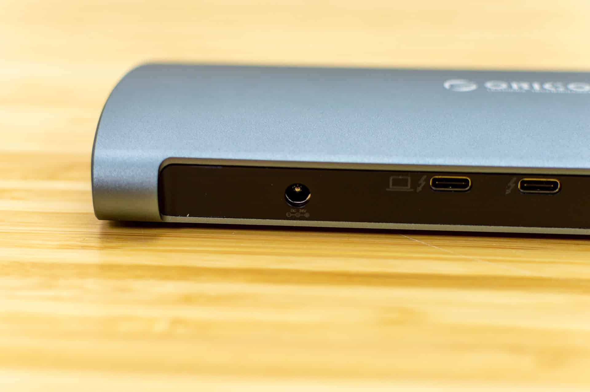 ما در قسمت عقب در سمت چپ ورودی برق این دستگاه را داریم. برای اینکه کار کند باید آن را از طریق یک ترانسفورماتور به جریان متصل کنیم که ۲۴ ولت را با جریان ۵ آمپر تزریق می کند. سپس یک کانکتور داده Thunderbolt 3 داریم که علاوه بر رعد و برق معمولی آیکونی دارد که لپ تاپ را شبیه سازی می کند. در کنار این یک پورت ورودی Thunderbolt 3 داریم. به عنوان مثال می توانیم یک کارت گرافیک خارجی را وصل کنیم.