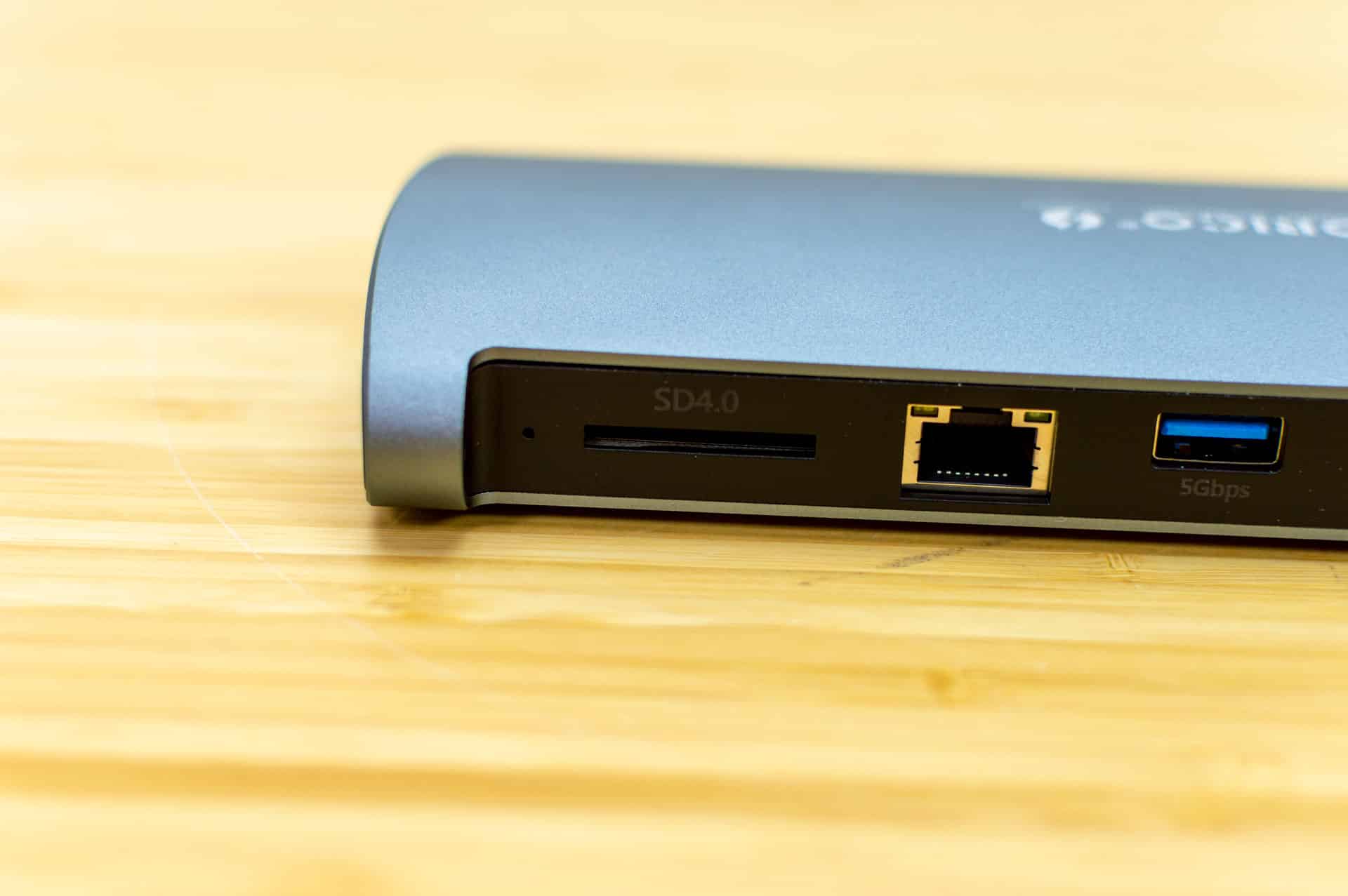 اکنون به قسمت جلوی ایستگاه Docking آلومینیومی Orico Thunderbolt 3 می رویم. در اینجا ما یک کارت خوان SD نسل ۴.۰ با پشتیبانی از کارت های حافظه تا ظرفیت ۲ ترابایت داریم. این داک همچنین دارای یک کانکتور RJ1 با سرعت ۴۵ گیگابیت بر ثانیه است که برای کار، دانلود و بازی ایده آل است.