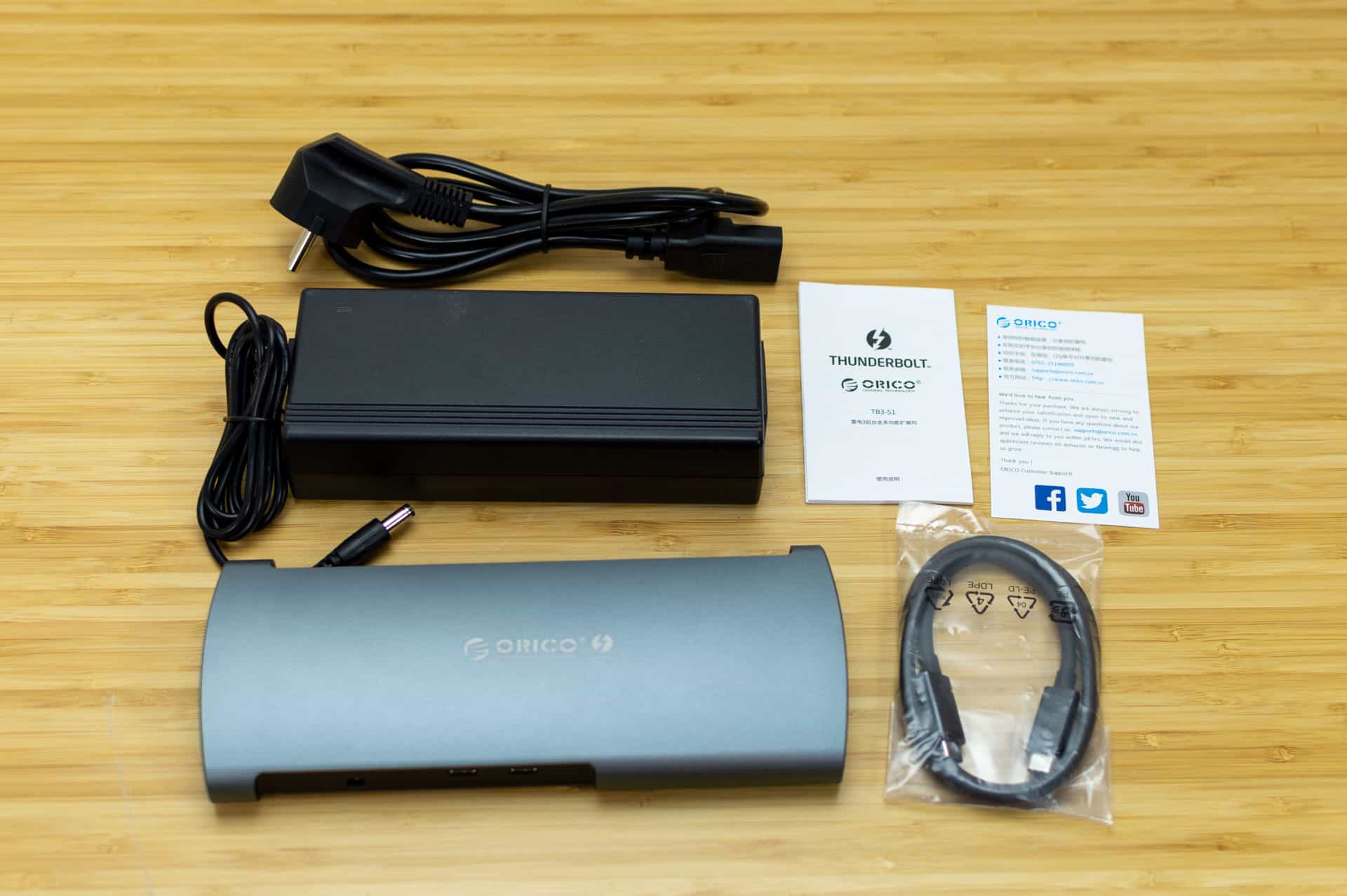 وقتی جعبه را باز میکنیم اولین چیزی که میبینیم ایستگاه اتصال آلومینیومی Orico Thunderbolt 3 است. می بینیم که واحد به خوبی توسط یک تکیه گاه پلی استایرن محافظت می شود. تحت این محافظ ترانسفورماتور قدرت، یک کابل Thunderbolt 3 و یک دفترچه راهنمای کوچک را پیدا می کنیم. نشان دهید که ترانسفورماتور غول پیکر، بلندتر از هاب تاندربولت و عملاً به همان اندازه است، چیزی که به نظر ما پوچ است.